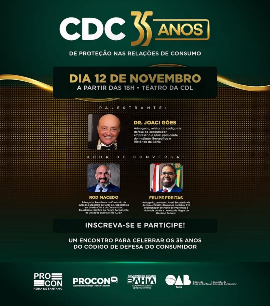 “Será um momento de reflexão e troca de experiências sobre a relevância do CDC na proteção do cidadão. Estamos muito motivados com essa oportunidade para Feira de Santana e para todos que atuam nas relações de consumo”, afirmou.